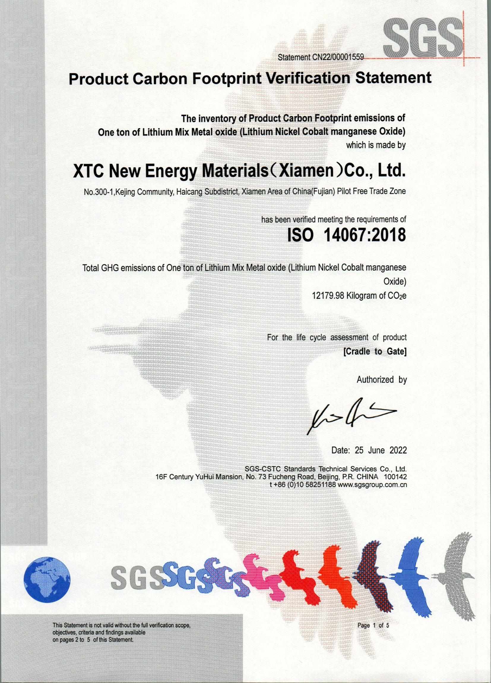 厦门、三明、宁德基地碳足迹14067认证书公示
